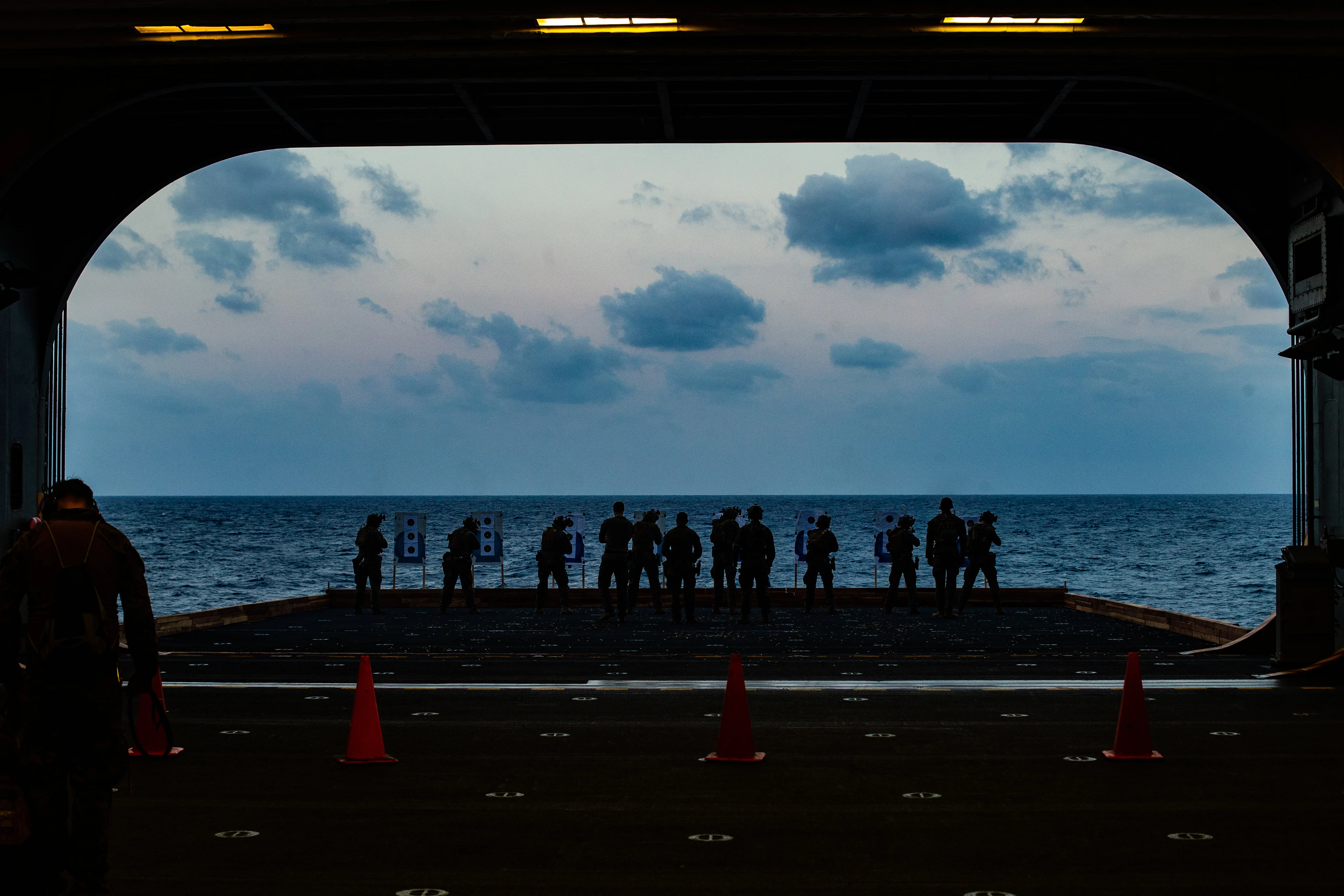 PHILIPPINE SEA (March 26, 2020) Marines with the 31st Marine Expeditionary Unit’s (MEU) Maritime Raid Force take part in a deck shoot aboard amphibious assault ship USS America (LHA 6). America, flagship of the America Expeditionary Strike Group, 31st MEU team, is operating in the U.S. 7th Fleet area of operations to enhance interoperability with allies and partners and serve as a ready response force to defend peace and stability in the Indo-Pacific region. (Official U.S. Marine Corps photo by Cpl. Isaac Cantrell)