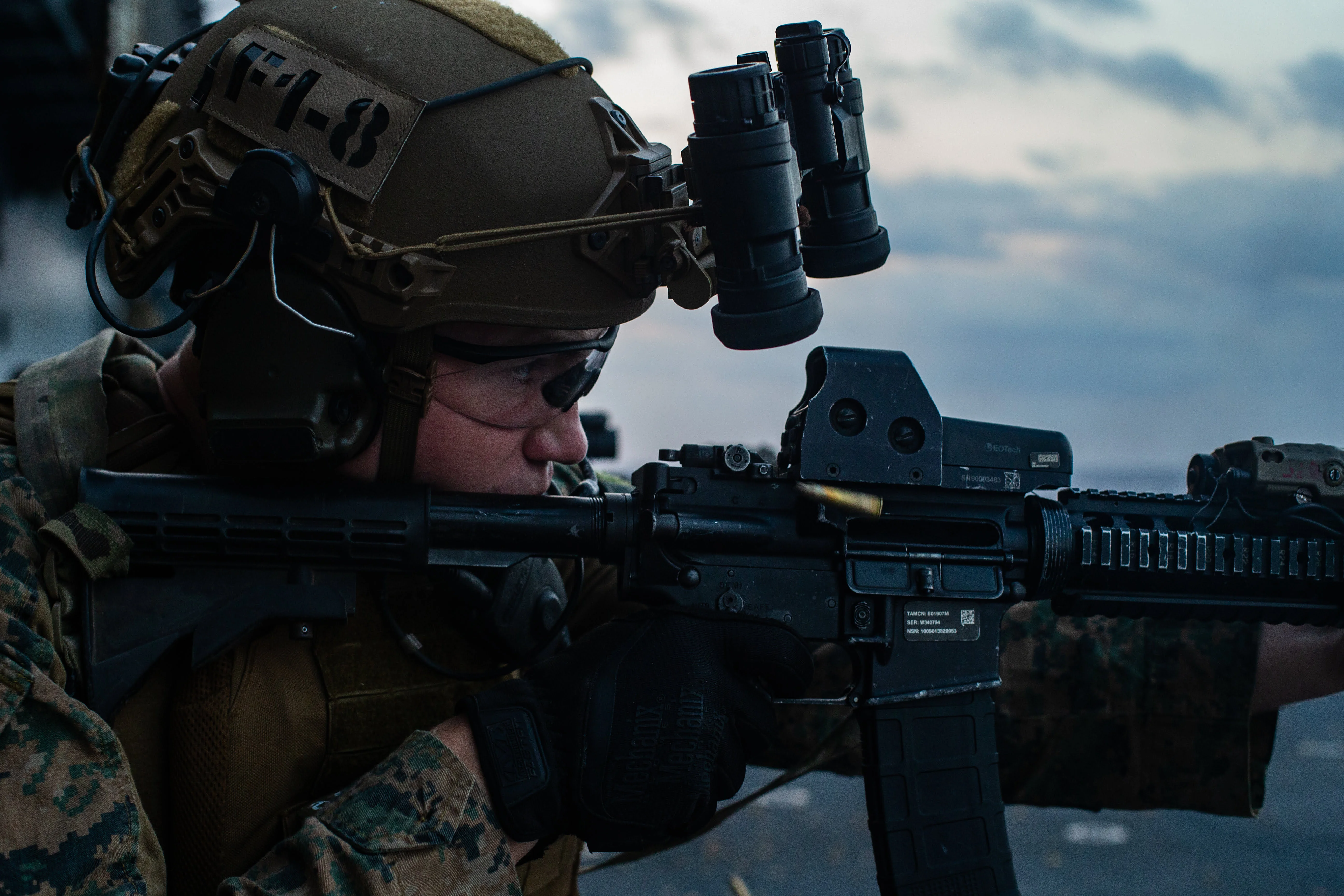PHILIPPINE SEA (March 26, 2020) A Marine with the 31st Marine Expeditionary Unit’s (MEU) Maritime Raid Force fires his M4A1 service rifle during a deck shoot aboard amphibious assault ship USS America (LHA 6). America, flagship of the America Expeditionary Strike Group, 31st MEU team, is operating in the U.S. 7th Fleet area of operations to enhance interoperability with allies and partners and serve as a ready response force to defend peace and stability in the Indo-Pacific region. (Official U.S. Marine Corps photo by Cpl. Isaac Cantrell)
