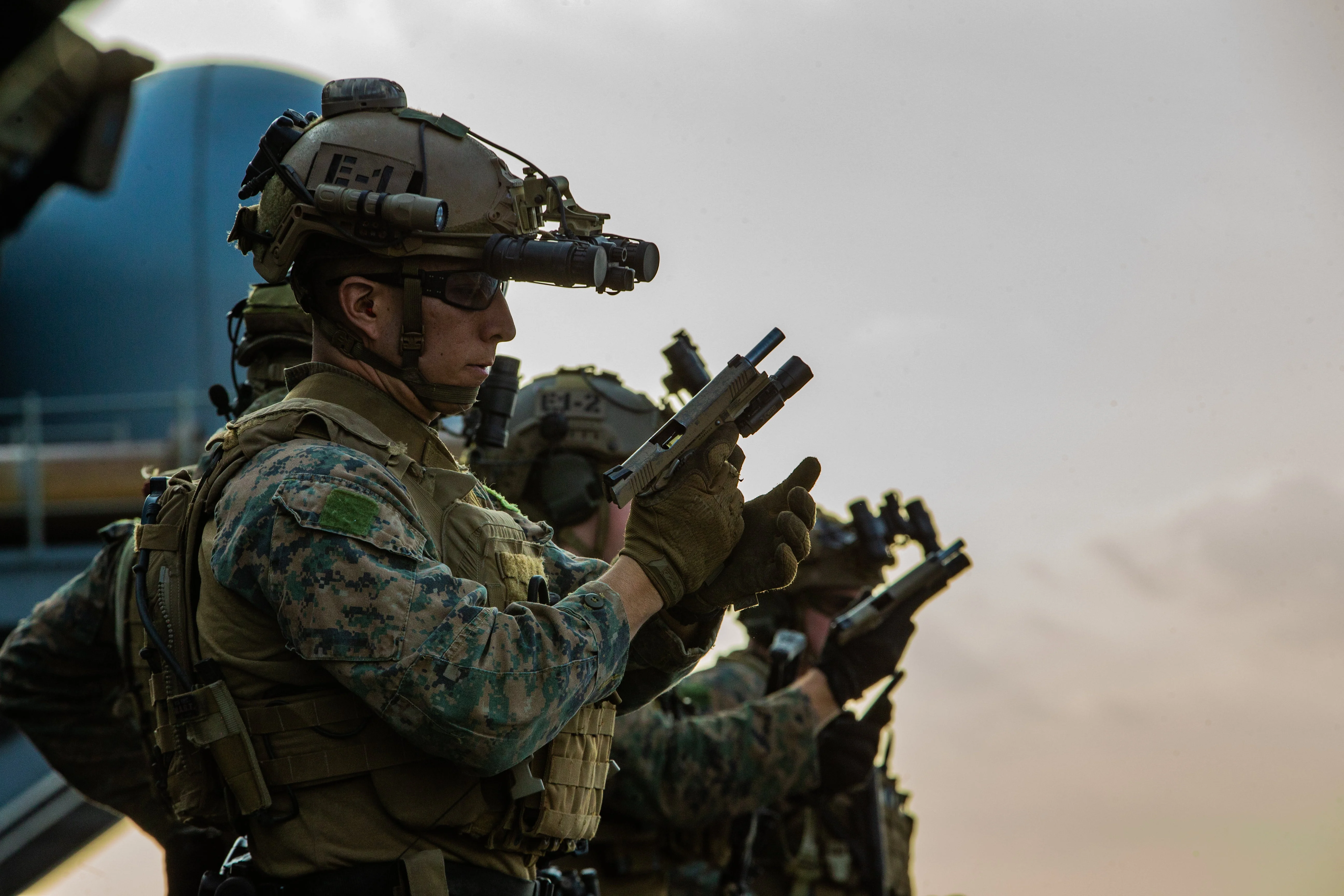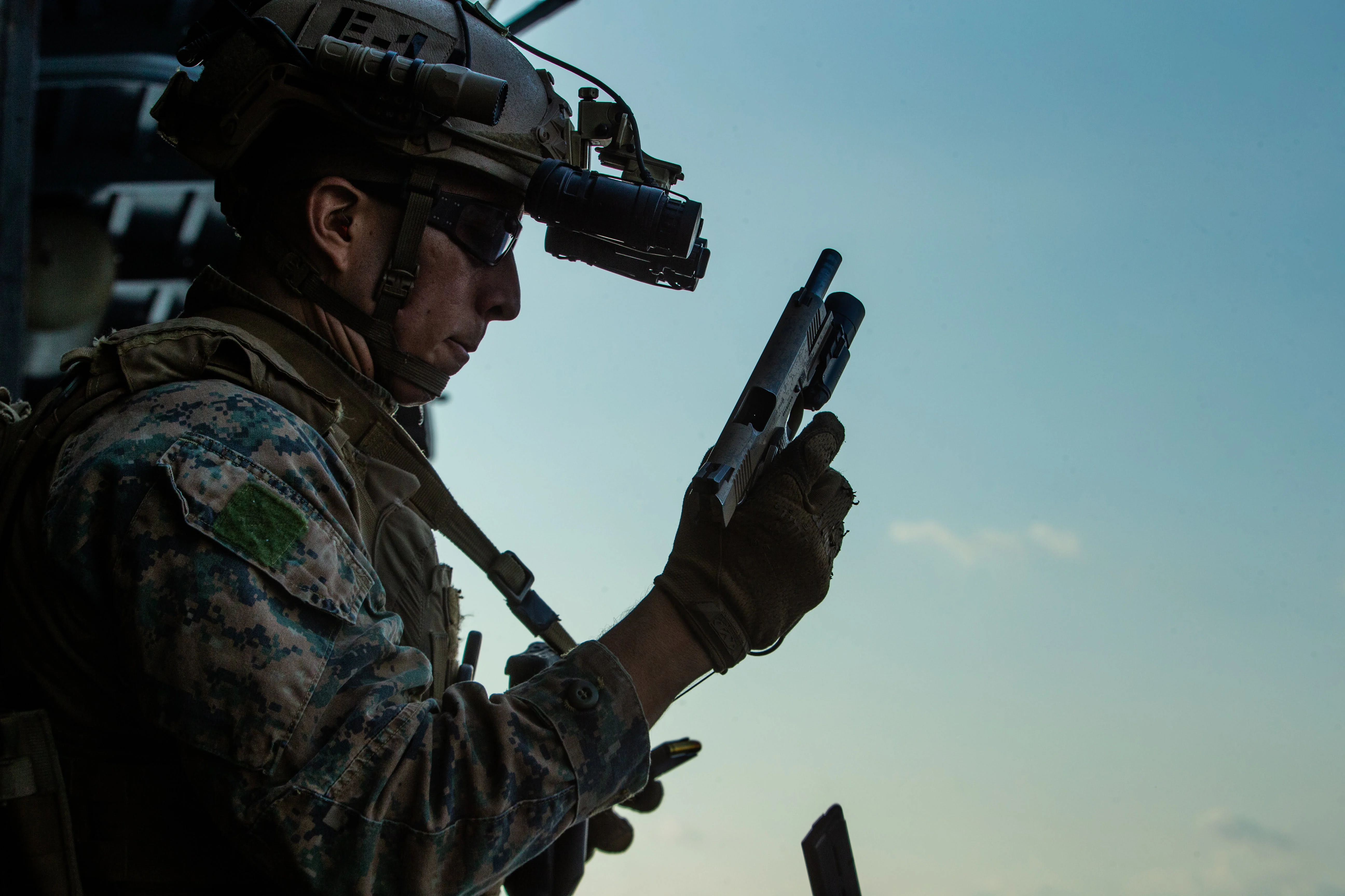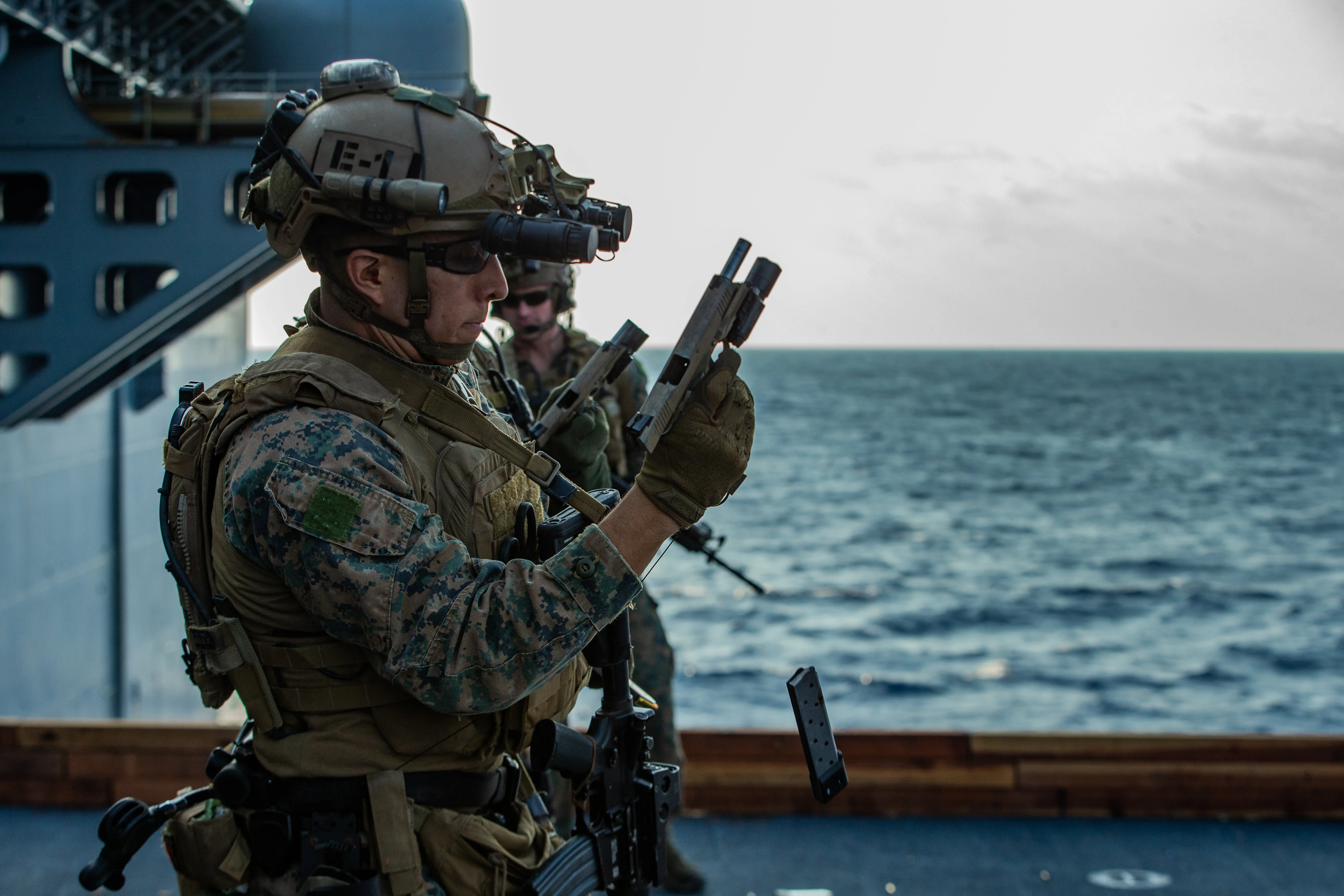 PHILIPPINE SEA (March 26, 2020) A Marine with the 31st Marine Expeditionary Unit’s (MEU) Maritime Raid Force reloads his M45A1 service pistol during a deck shoot aboard amphibious assault ship USS America (LHA 6). America, flagship of the America Expeditionary Strike Group, 31st MEU team, is operating in the U.S. 7th Fleet area of operations to enhance interoperability with allies and partners and serve as a ready response force to defend peace and stability in the Indo-Pacific region. (Official U.S. Marine Corps photo by Cpl. Isaac Cantrell) (Marines look pretty close together in this photo)