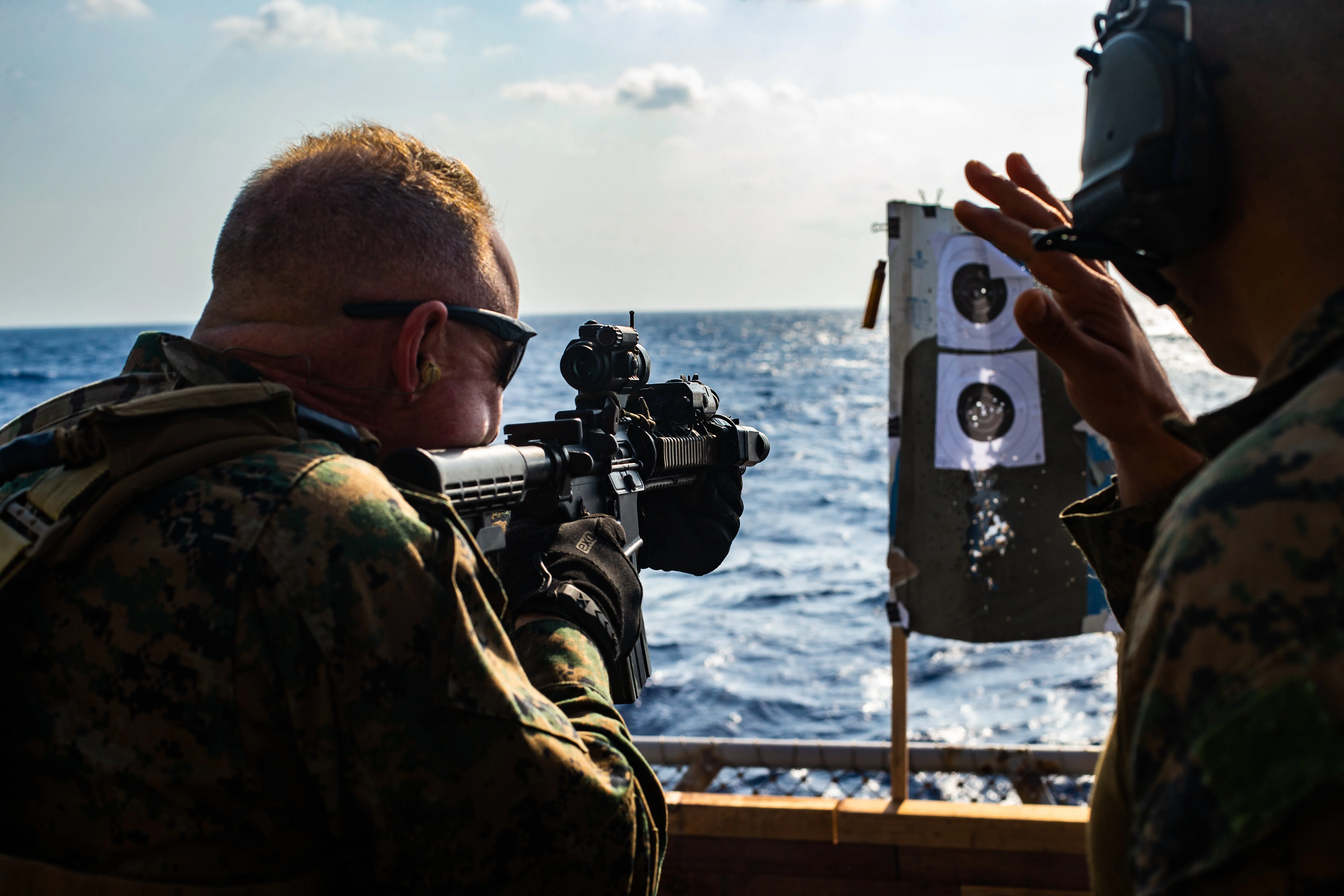 PHILIPPINE SEA (March 26, 2020) Sgt. Maj. Douglas Gerhardt, sergeant major of the 31st Marine Expeditionary Unit (MEU), fires an M4A1 service rifle during a deck shoot aboard amphibious assault ship USS America (LHA 6). America, flagship of the America Expeditionary Strike Group, 31st MEU team, is operating in the U.S. 7th Fleet area of operations to enhance interoperability with allies and partners and serve as a ready response force to defend peace and stability in the Indo-Pacific region. (Official U.S. Marine Corps photo by Cpl. Isaac Cantrell)