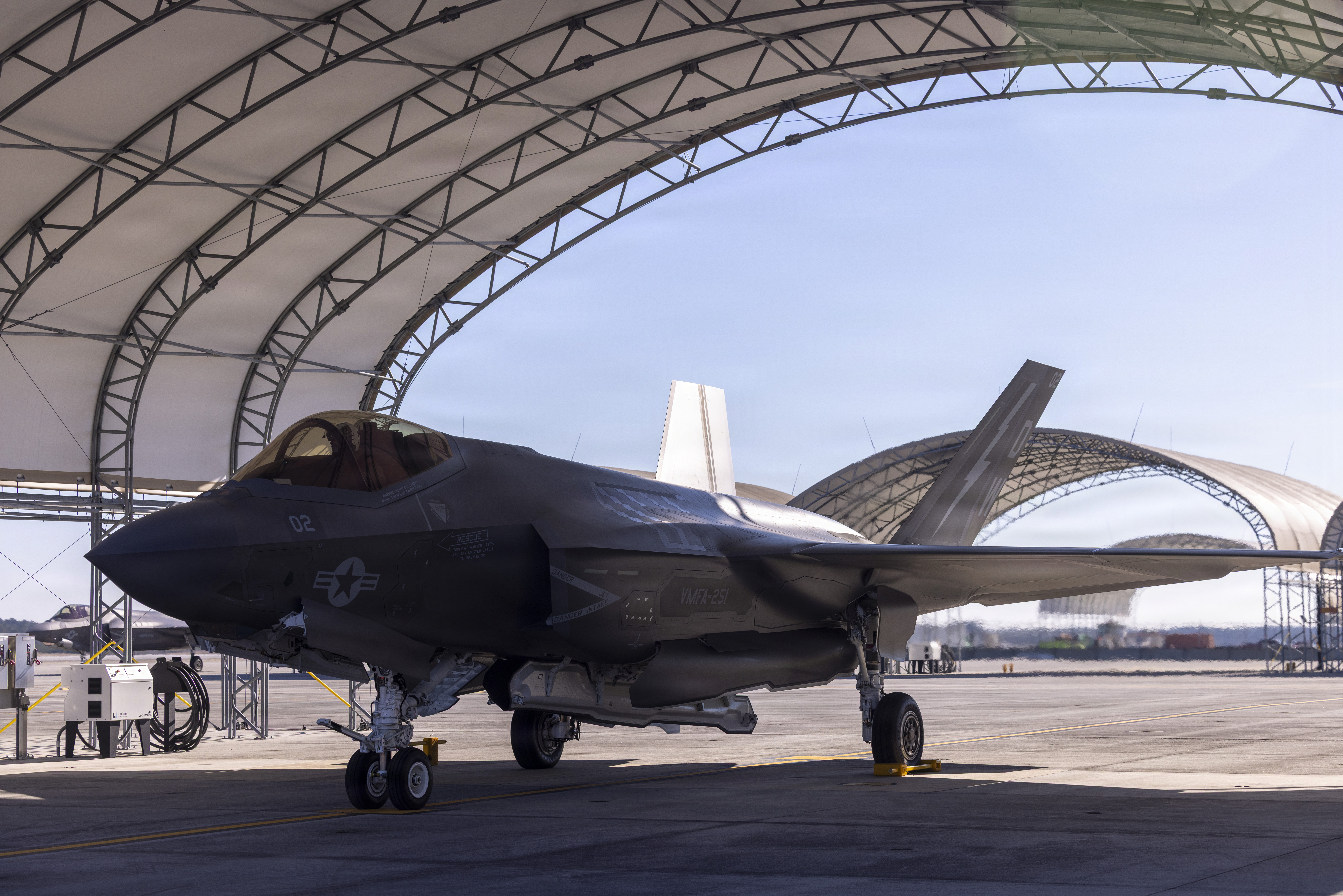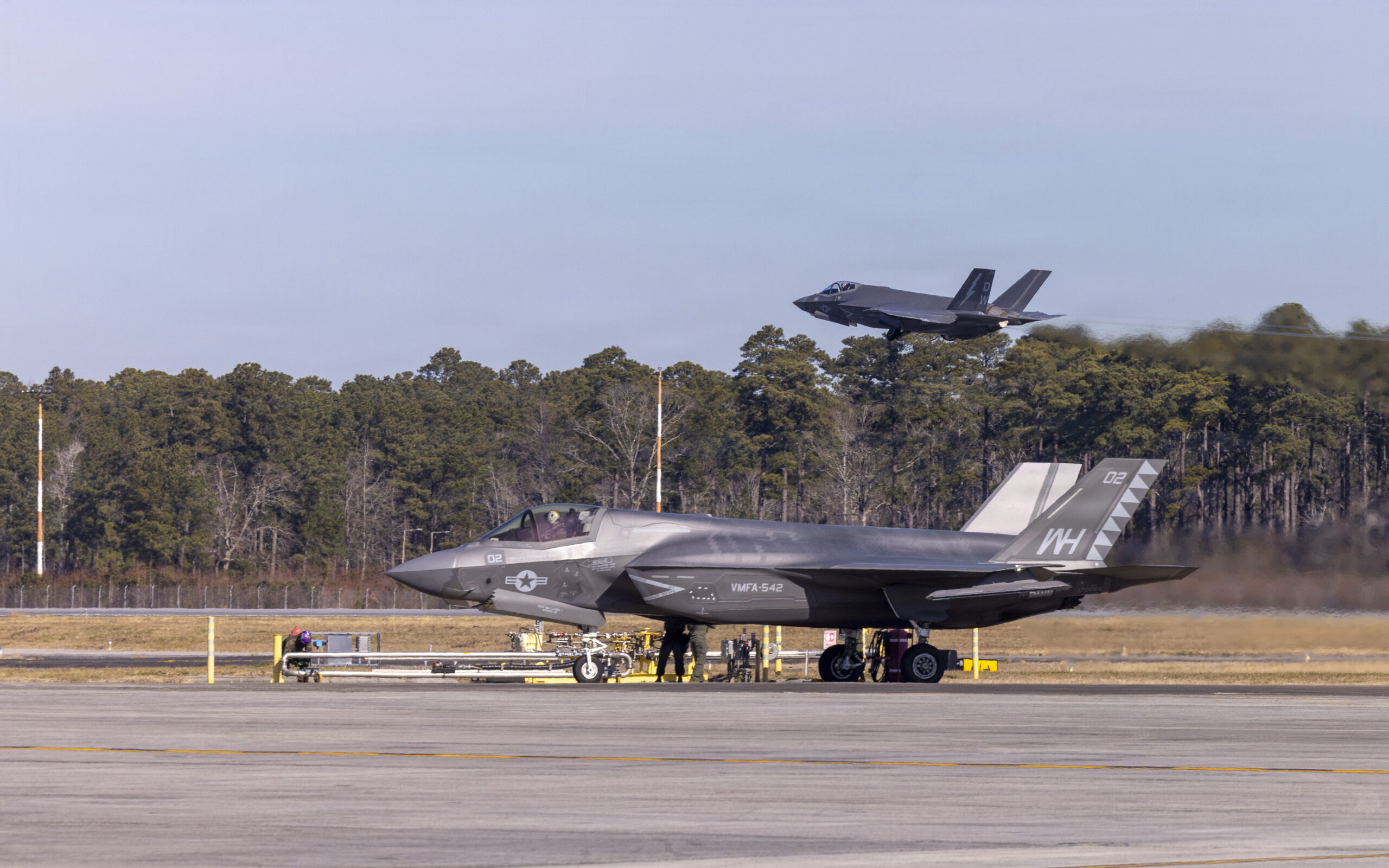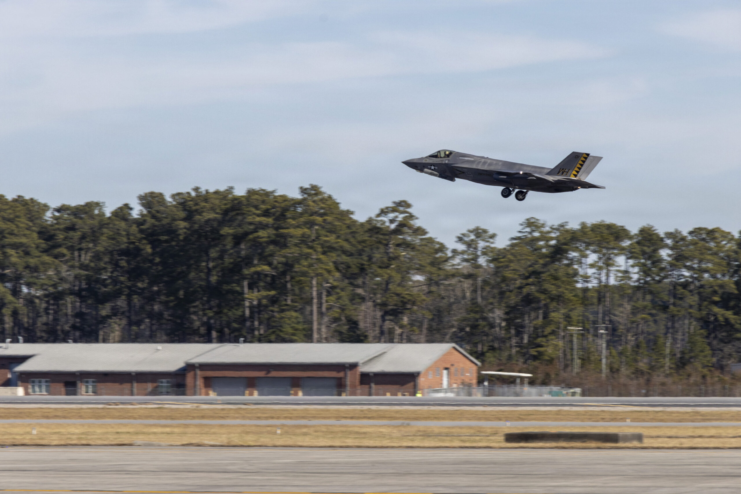 A U.S. Marine Corps F-35B Lightning II jet assigned to Marine Fighter Attack Squadron (VMFA) 542, Marine Aircraft Group 14, 2nd Marine Aircraft Wing, takes off during Atlantic Lightning 26-1 at Marine Corps Air Station Cherry Point, North Carolina, Jan. 29, 2025. Atlantic Lightning 26-1 is a tactical aircraft exercise focused on Marine Air-Ground Task Force and Joint Force integration and distributed aviation operations, including offensive and defensive counter-air, suppression of enemy air defenses, close air support, and expeditionary operations. (U.S. Marine Corps photo by Lance Cpl. Michael Robinson)