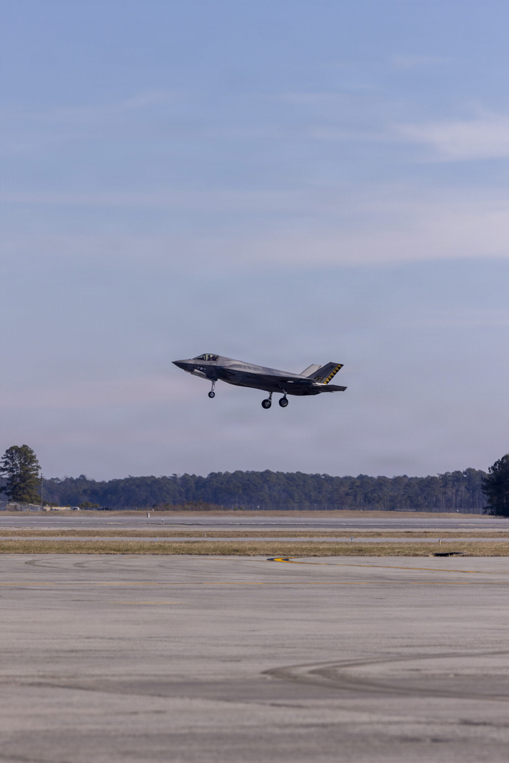 A U.S. Marine Corps F-35B Lighting II jet assigned to Marine Fighter Attack Squadron (VMFA) 542, Marine Aircraft Group 14, 2nd Marine Aircraft Wing, takes off during Atlantic Lightning 26-1 at Marine Corps Air Station Cherry Point, North Carolina, Jan. 29, 2025. Atlantic Lightning 26-1 is a tactical aircraft exercise focused on Marine Air-Ground Task Force and Joint Force integration and distributed aviation operations, including offensive and defensive counter-air, suppression of enemy air defenses, close air support, and expeditionary operations. (U.S. Marine Corps photo by Lance Cpl. Gavin K. Kulczewski)