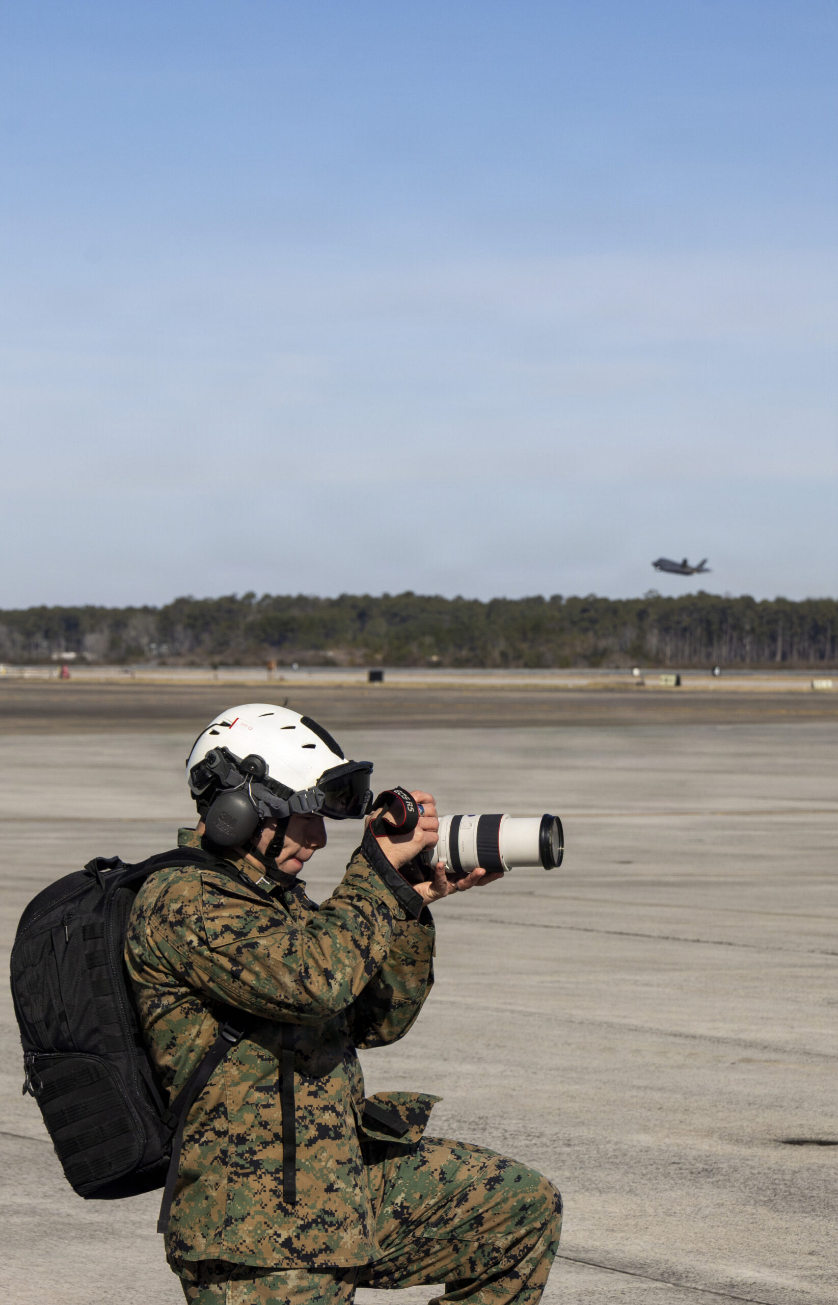 U.S. Marine Corps Lance Cpl. Michael Robinson, from Florida, a combat photographer with Marine Wing Headquarters Squadron (MWHS) 2, 2nd Marine Aircraft Wing, photographs F-35B Lightning II aircraft during Atlantic Lightning 26-1 at Marine Corps Air Station Cherry Point, North Carolina, Jan. 29, 2025. Atlantic Lightning 26-1 is a tactical aircraft exercise focused on Marine Air-Ground Task Force and Joint Force integration and distributed aviation operations, including offensive and defensive counter-air, suppression of enemy air defenses, close air support, and expeditionary operations. (U.S. Marine Corps photo by Lance Cpl. Gavin K. Kulczewski)